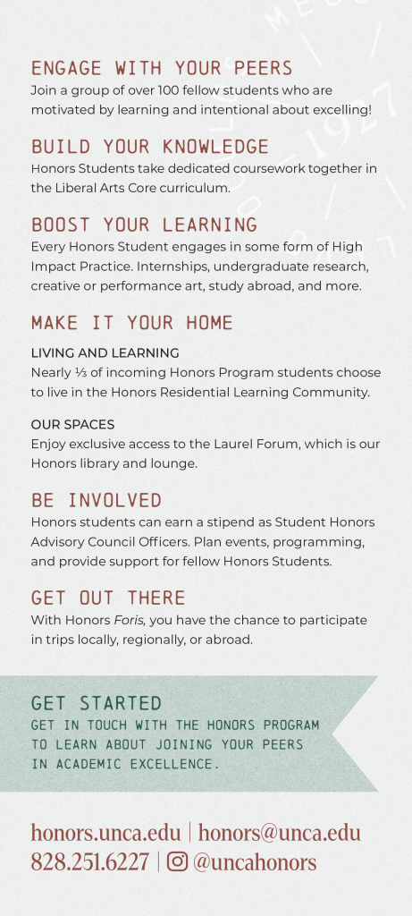 UNC Asheville’s Honors Program was founded in 1985 and provides a rich curriculum for motivated students who seek to understand themselves and make a difference in the world. Together, students, staff, and faculty create a community of dedicated and enthusiastic scholars who are committed to liberal learning by means of enhanced advising, mentoring, experiential learning, and other support services. Honors students have opportunities to: