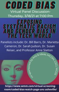 UNC Asheville will host a virtual panel discussion on the film Coded Bias titled Exposing Systematic Racism and Gender Bias in the Tech World at 7 p.m. on Thursday, March 18. Panelists include Bill Barrs, Marietta Cameron, Sarah Judson, Susan Reiser and Anne Slatton.