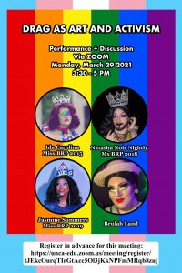 Join us March 29, 2021, 3:30 – 5 PM for Drag as Art and Activism. Four Performances + Audience Discussion with Western North Carolina drag artists. Featuring: