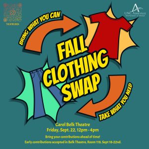 Participants are invited to bring two to 10 clean items of clothing in good condition to Belk Theatre, room 118, between Monday, Sept.18 and the event opening on Friday, Sept. 22 at noon. Late donations will also be accepted.