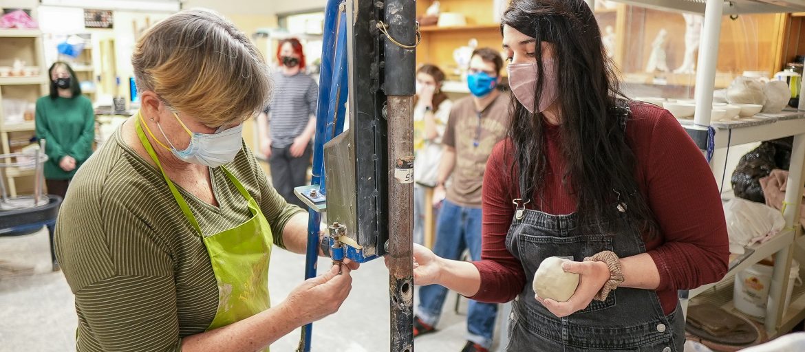 Madison Carson, a senior majoring in environmental studies and art from Needham, Massachusetts, works as a student academic course ambassador in Professor of Art Megan Wolfe’s Ceramics I class, a course that Carson skipped taking at UNC Asheville as a transfer student. Now she has hands-on experience in course instruction, a valuable skill for this future educator.