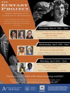 UNC Asheville will host three community conversations exploring the power of ecstatic experience as a sacred vehicle for transcendence. Hosted by Classics Professor Sophie Mills, “The Ecstasy Project” will use Euripides’ Bacchae as the context for exploring ecstasy in different dimensions and world cultures. The three virtual events will be held March 18, April 14 and April 26.