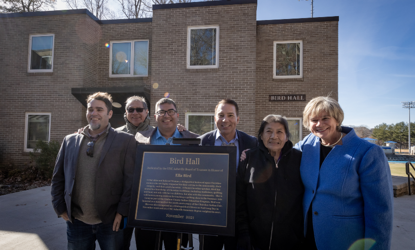 On the University of North Carolina Asheville campus, an established building now bears a new name. This week, UNC Asheville’s campus community, along with members of the Eastern Band of Cherokee Indians, gathered to celebrate the presentation of Bird Hall, named for Ella Bird, Beloved Woman of the Eastern Band of Cherokee Indians and 2017 UNC Asheville honorary degree recipient.