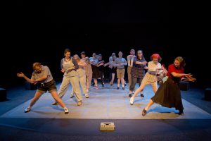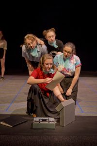 The almost nothing could almost fit in a big suitcase. It consists of a violin, an old typewriter, a few archive boxes, a small mattress, a few folders and papers, and a roll of tape to mark a grid on the stage floor in a totally set-free production. These few props were chosen by the student actors to help them summon forth students from 70 years ago at Black Mountain College (BMC) in vignettes, interruptions, songs, and choreography—all original—in a work of devised theater they will perform at Festival Fringe.